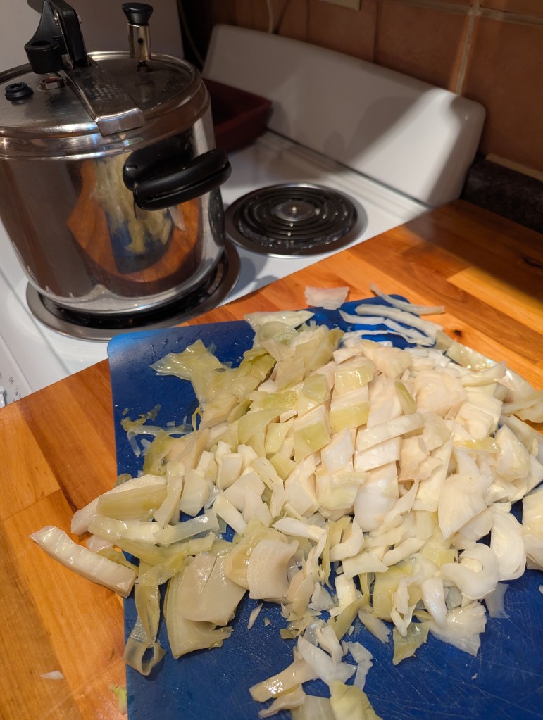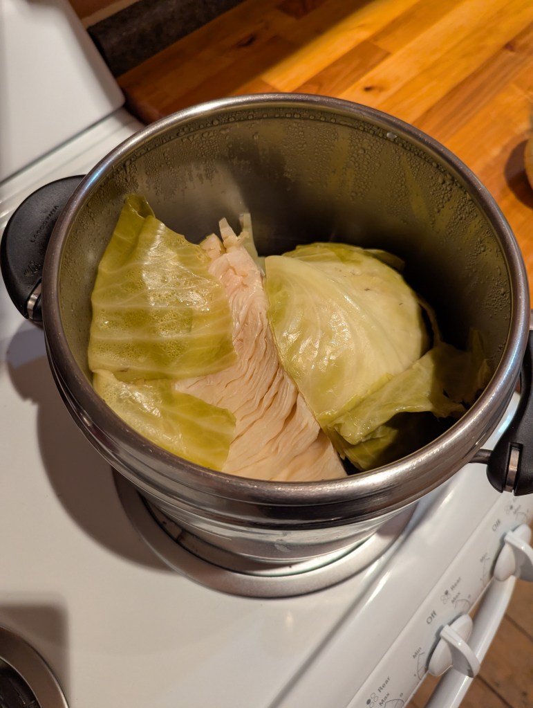 I pressure cook my cabbage first because I like it really soft and then add coarsely chopped Fennel because I like it crunchy. Also puree half the cabbage with a handful of cashews to make the soup thicker.