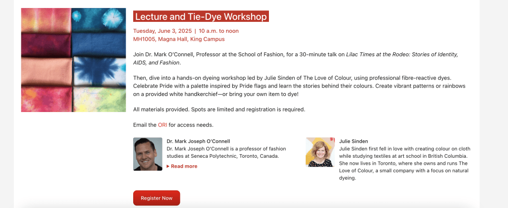 Join Dr. Mark O’Connell, Professor at the School of Fashion, for a 30-minute talk on Lilac Time at the Rodeo: Stories of Identity, AIDS, and Fashion.